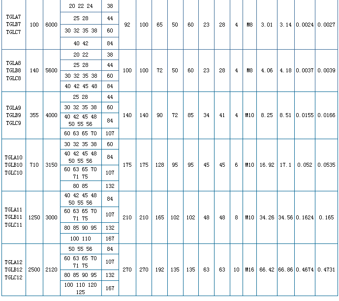注:1、瞬時過載轉(zhuǎn)矩不得大于公稱轉(zhuǎn)矩的2倍。 2、質(zhì)量和轉(zhuǎn)動慣量是各型號中*大值的近似計算值。 3、B1是保證原動機(jī)或工作機(jī)安裝所必需的*小尺寸。 4、推薦TGL10~TGL12采用B型。 TGL聯(lián)軸器許用補(bǔ)償量 |