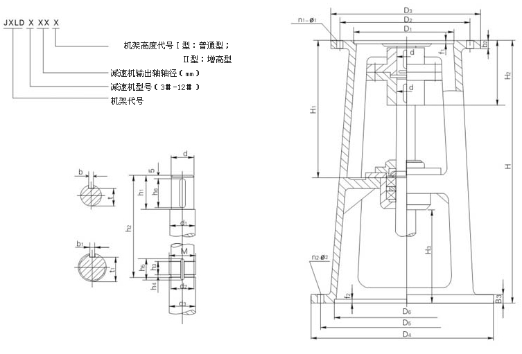 機架代號 | 減速機出軸軸徑d | 攪拌軸軸端尺寸 | 外形及聯(lián)接尺寸 | Ⅰ型 | Ⅱ型 | ||||||||||||||||||||||||||||