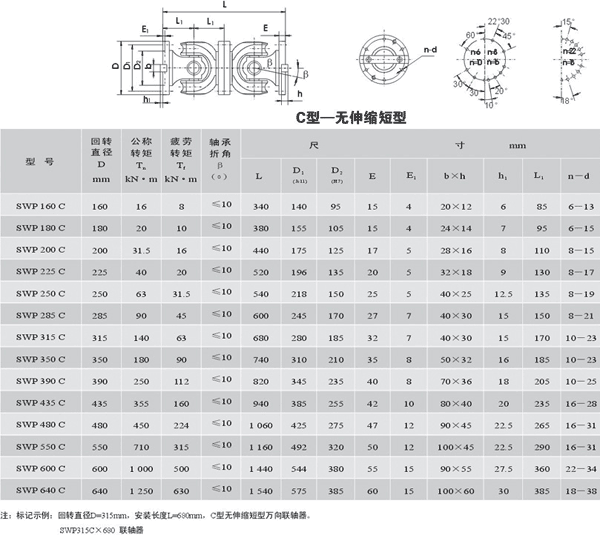 SWC型、SWP型十字軸式萬向聯(lián)軸器是一種*常用的聯(lián)軸器。利用其結(jié)構(gòu)的特點(diǎn)能使不在同一軸線或軸線折角較大或軸向移動(dòng)較大的兩軸等角速連續(xù)回轉(zhuǎn),并可靠地傳遞轉(zhuǎn)矩和運(yùn)動(dòng)。能廣泛應(yīng)用于冶金、起重、工程運(yùn)輸、礦山、石油、船舶、煤炭、橡膠、造紙機(jī)械及其它重機(jī)行業(yè)的機(jī)械軸系中傳遞轉(zhuǎn)矩。